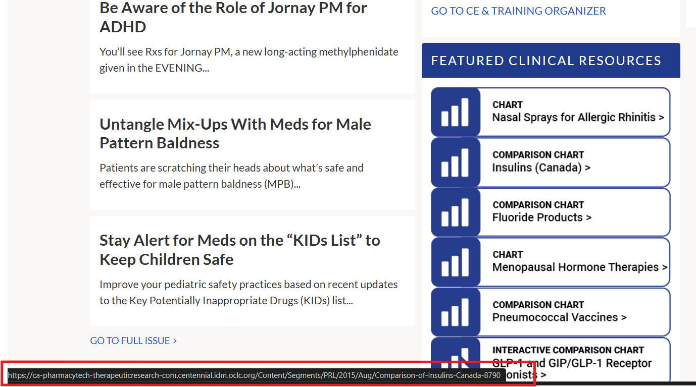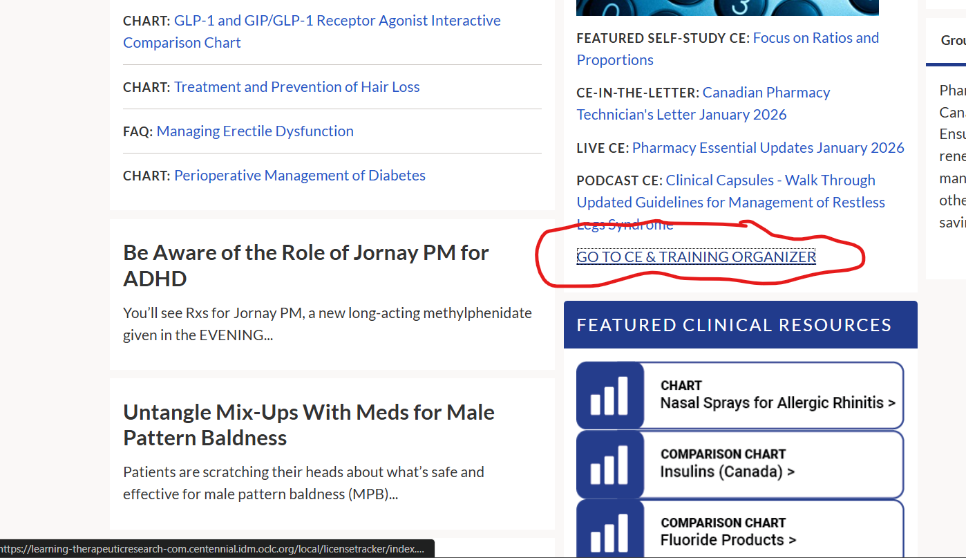 Notes: There are links in the middle of the page under Featured Clinical Resources where you can't see the indicator. There is text that pops up at the bottom of the page that indicates where you are, but it's not as intuitive as an actual highlight to follow along with. In the two pictures provided, you can see the keyboard focus indicator in the CE & Training Organizer, but when the Comparison of Insulins link under Featured Clinical Resources is receiving focus, there's no visual cue except the black outlined text at the bottom of the page.