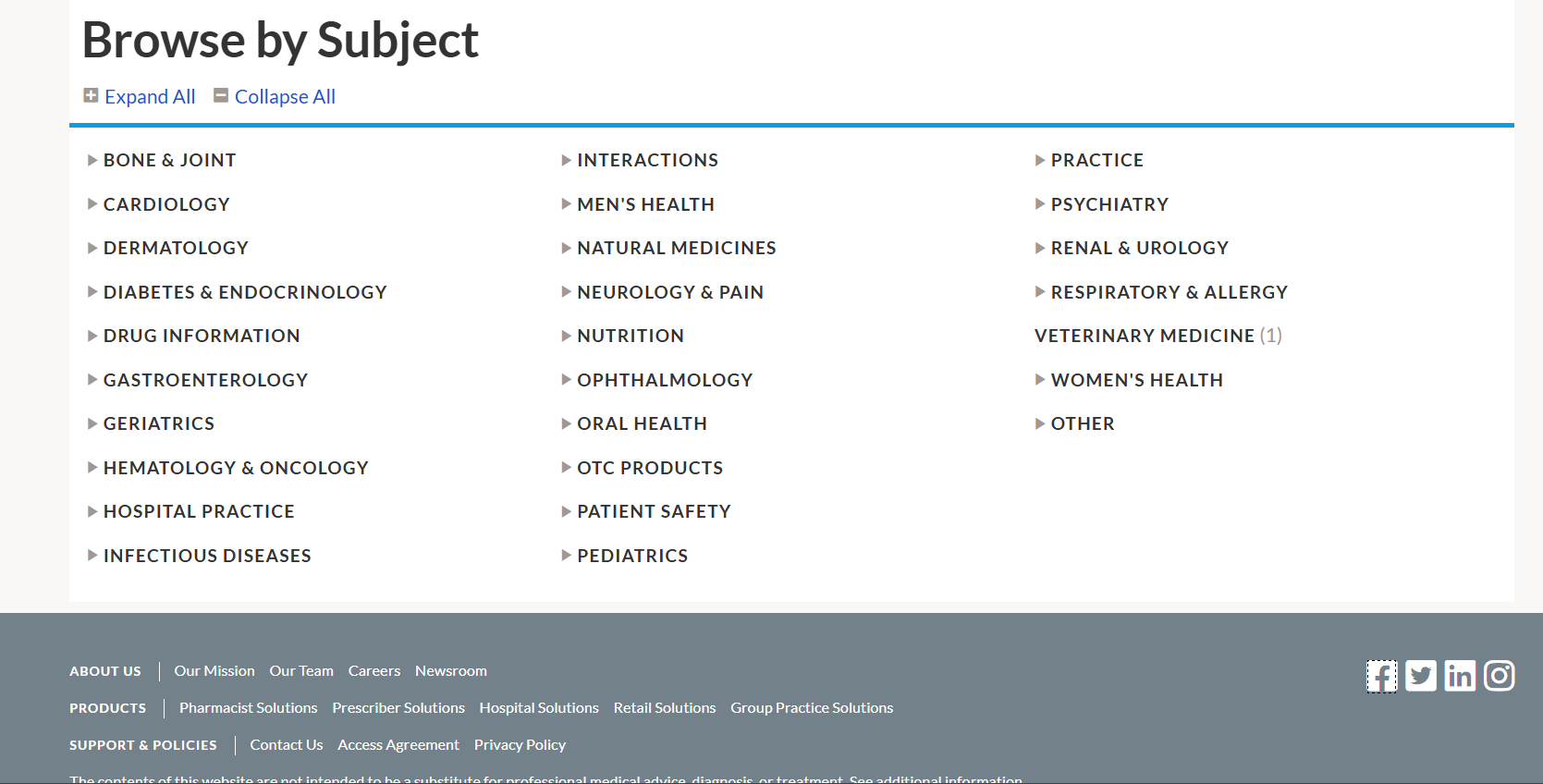 Notes: Drop-down lists only function if the mouse is used to either hover over the options in some cases, or to click the dropdown arrows in others. Otherwise, there seems to be no way to open dropdown menus with keyboard navigation alone. Additionally, in a screen that lists Browse by Subject options, the keyboard jumps from the Collapse All option to the Veterinary Medicine option, bypassing all other subject headings, and from to the Facebook link in the footer (see picture).