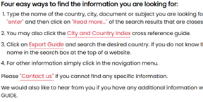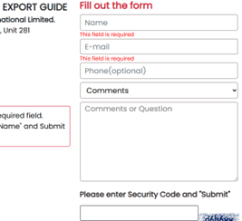 Notes: The user cannot proceed with the form unless all required fields are completed correctly. Additionally, a warning appears if an invalid Name or Email for contact form. However, there is no cue for the search field. Also, some of the text is red for instructions on how to search and use the Export Guide.